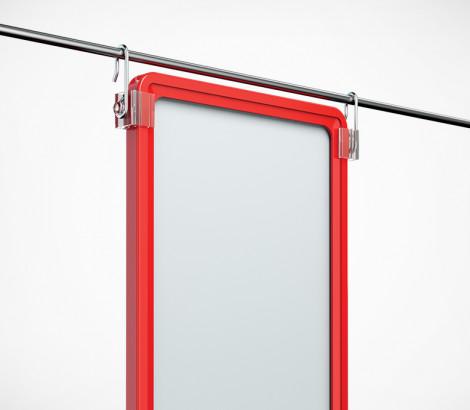 Крючок с подвижным основанием для крепления пластиковых рамок на подвесных профилях и металлических покупательских корзинах. Для подвешивания одной рамки необходимо два крючка разной ориентации (правый и левый). Закрепляются с боковых сторон рамки. Основание изготовлено из прозрачного ударопрочного пластика, крючок из стальной проволоки.