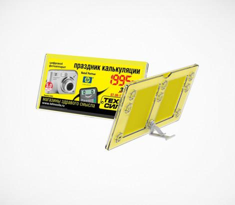 Универсальная рамка-ценникодержатель с девятью гнездами крепления рамки на разных уровнях относительно полки. Прорезь для рамки по широкой стороне рамки. Размер вставки - 210×99 мм (1/3 формата А4).