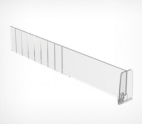 Разделитель DIV60-BT60 выс.60 мм с передним огран.60 мм — пластиковый разделитель с передним ограничителем. Имеет насечки с шагом 25 мм для обламывания по длине, материал: прозрачный ударопрочный пластик. Применение: для организации выкладки небольших лёгких товаров, таких как сигареты, лекарства, парфюмерия и косметика.