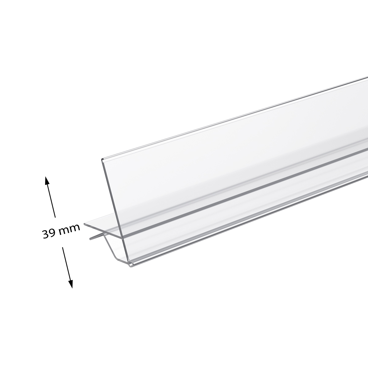 Ценникодержатель для стеклянных полок с углом наклона GLL-39 - предназначен для размещения ценников на стеклянных и деревянных полках толщиной 4–6 мм в аптеках, магазинах косметики и парфюмерии, а также в оптике. Одновременно является передним ограничителем, упрощая конструкцию оборудования на полке, имеет небольшой угол наклона к торцу полки для лучшего обзора ценников покупателями.