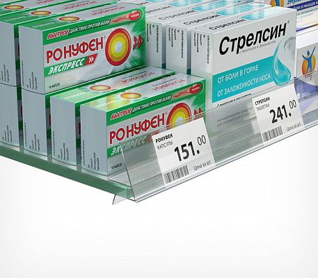 Имеет небольшой угол наклона к торцу полки для лучшего обзора ценников покупателями.