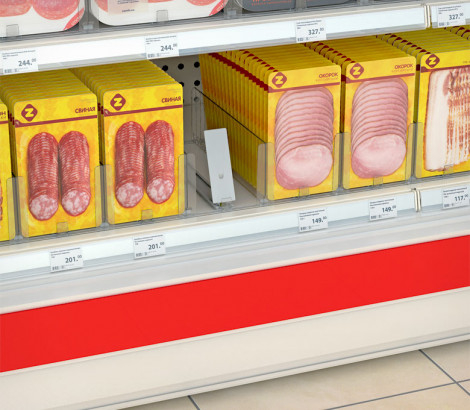 Пружинный толкатель FORTA GROSSA-1 имеет наклонную толкающую поверхность размером 44х132 мм с передним прямым ограничителем 20х25 мм. Разработан для товаров в высокой, твердой и полутвердой упаковке, с неустойчивым основанием, например: плиточного шоколада, сырной, мясной и рыбной нарезок