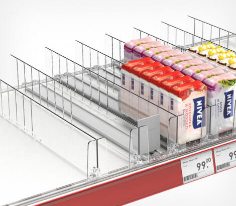 Пластиковая задняя опора используется индивидуально или в комплекте с ребристым профилем BACKLINE. Ребристые выступы в нижней части опоры удерживают плоские упаковки товара, обеспечивая его идеальную подачу покупателю.