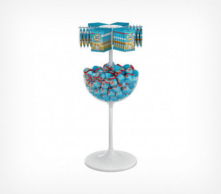 Дисплей UNIBOWL-24-HP-6 предназначен для выкладки товаров в компактной и неустойчивой упаковке в чаше и в упаковке с широкой петлёй (европетля) для подвешивания на крючках.